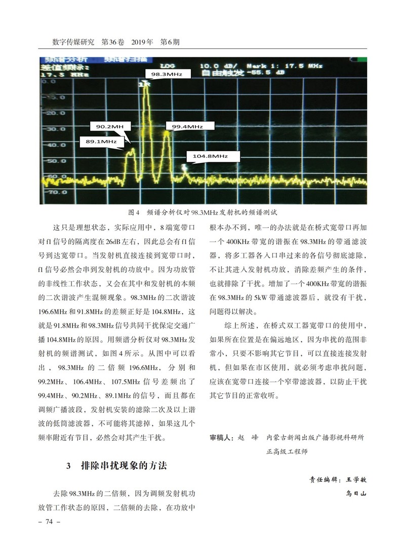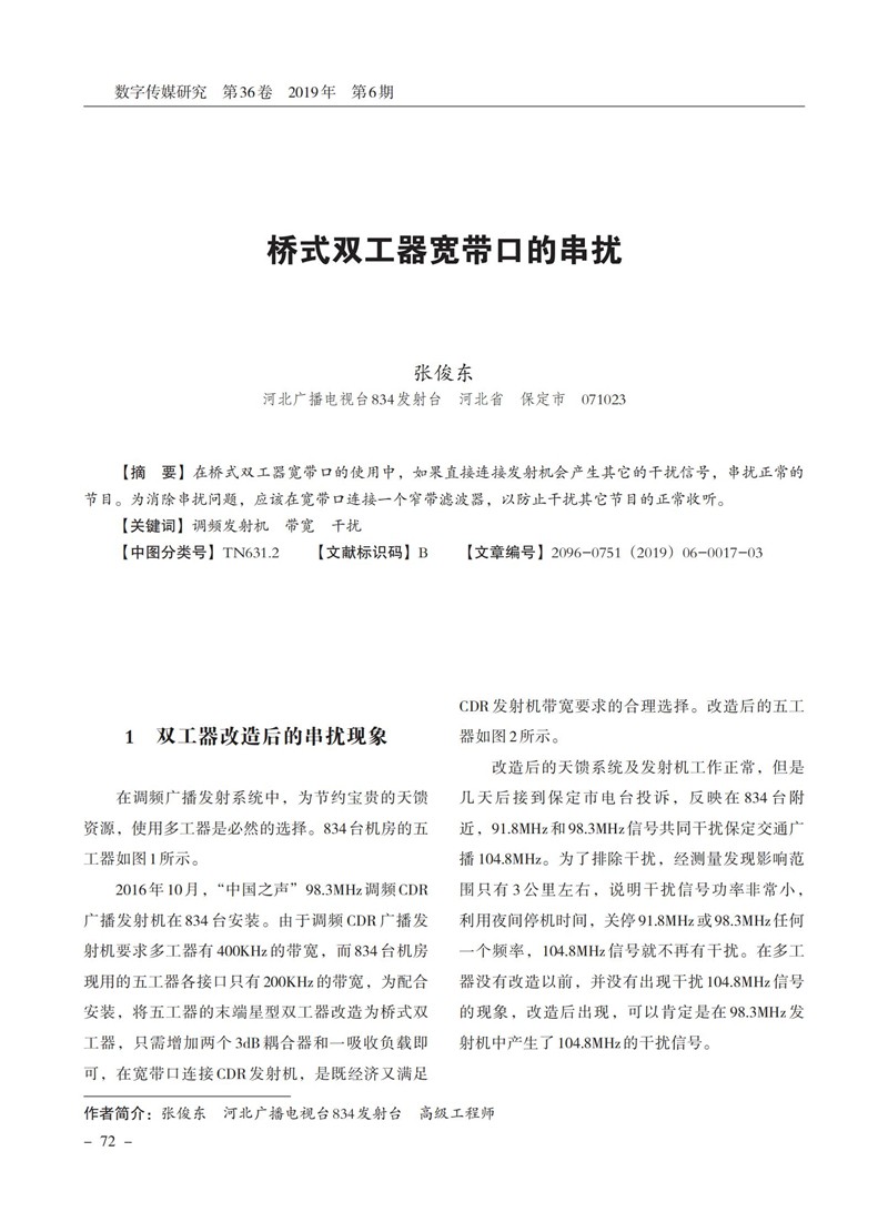 【摘 要】 在桥式双工器宽带口的使用中,如果直接连接发射机会产生其它的干扰信号,串扰正常的 节目。为消除串扰问题,应该在宽带口连接一个窄带滤波器,以防止干扰其它节目的正常收听。